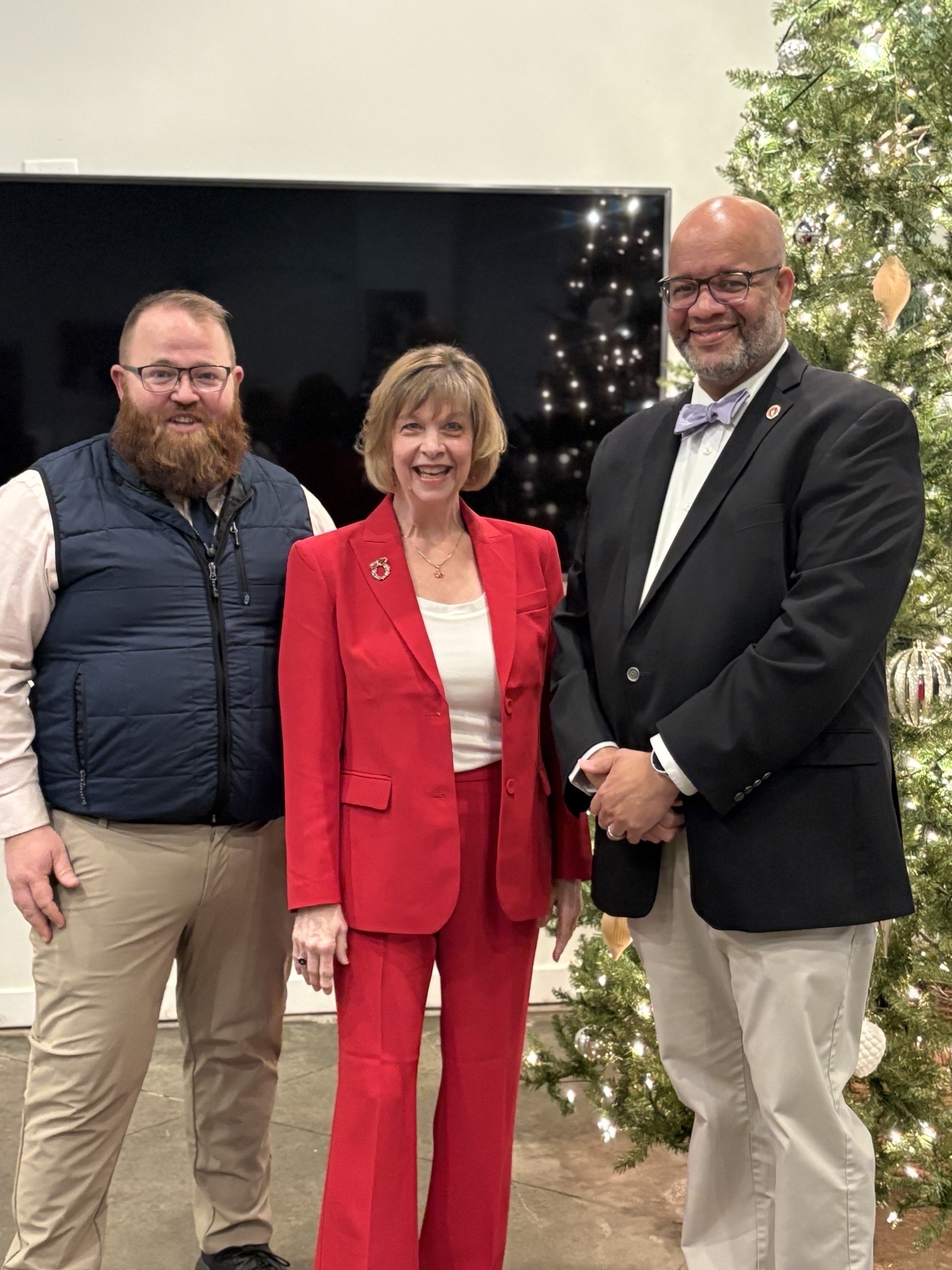Jake Wilson, 2025-26 NC Charter Principal of the Year, and Dr. Jason Johnson, 2025 State Principal of the Year with Deborah Brown during her surprise announcement ceremony.